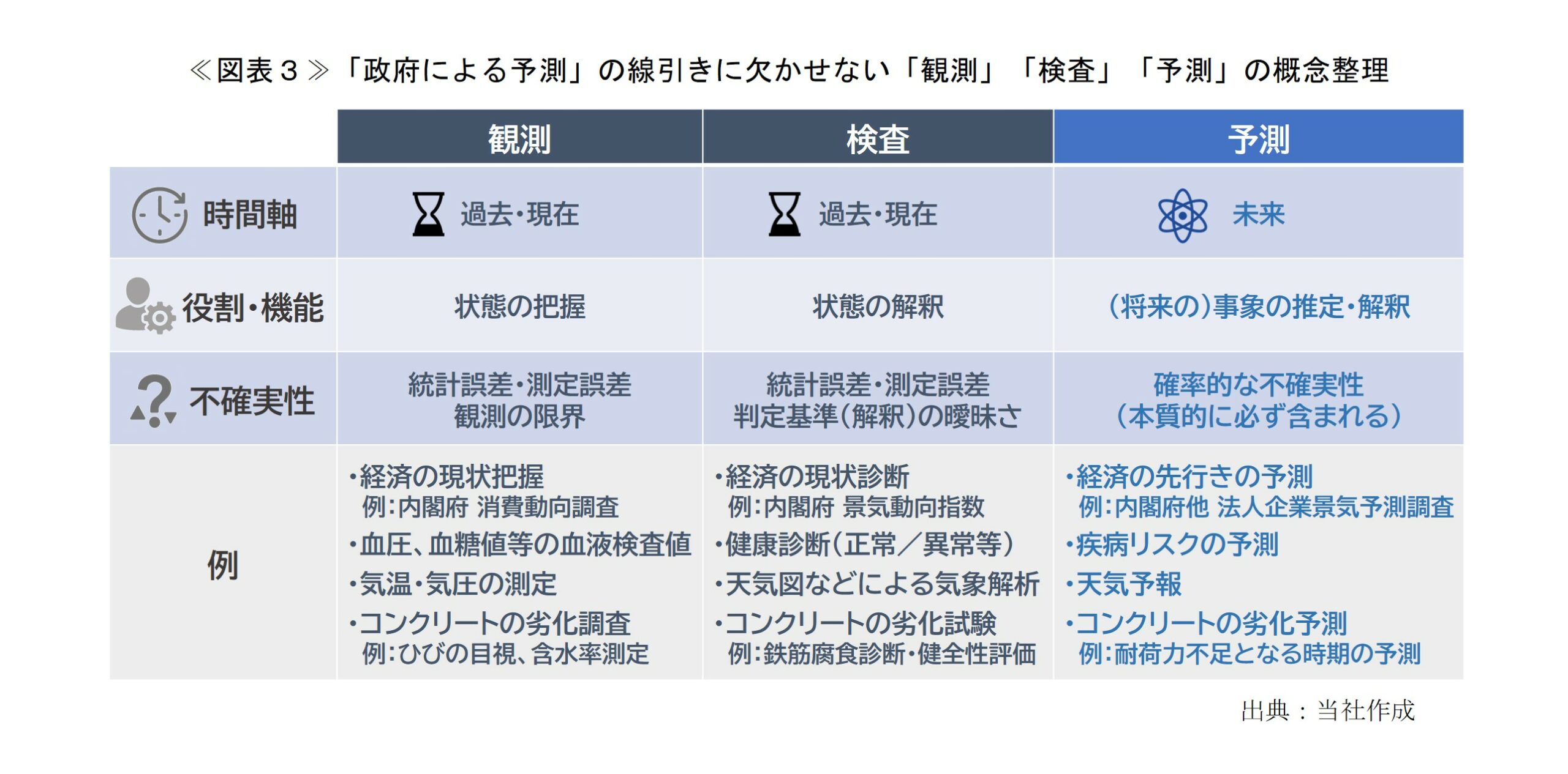 この問いに唯一の正解は存在しないが、対象とする予測を絞り込むため、「観測」「検査」「予測」のそれぞれを、「時間軸」「役割・機能」「不確実性」という3つの観点から整理した≪図表3≫。