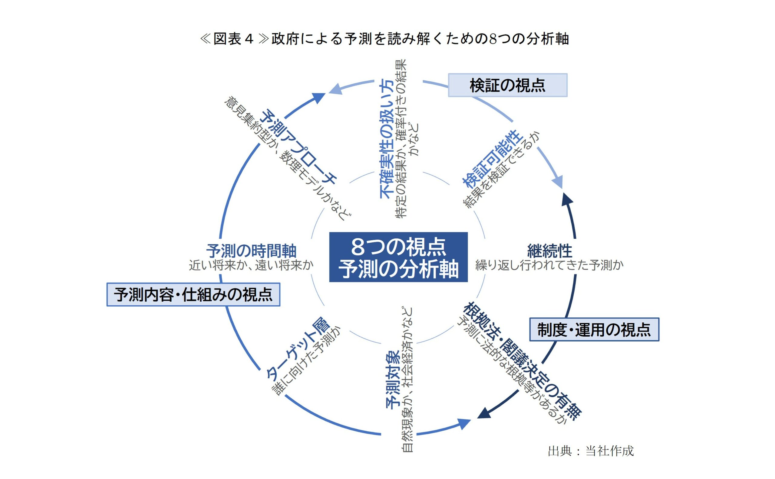 こうした問題意識のもと、本稿では、前半で予測とは何か、その価値の源泉、政府による予測の範囲など基本的な事項を整理した。後半では予測を読み解くための8つの視点を提示するとともに、令和以降に公表された「政府による予測」がおよそ320件に上るという今回の推計結果を示した。