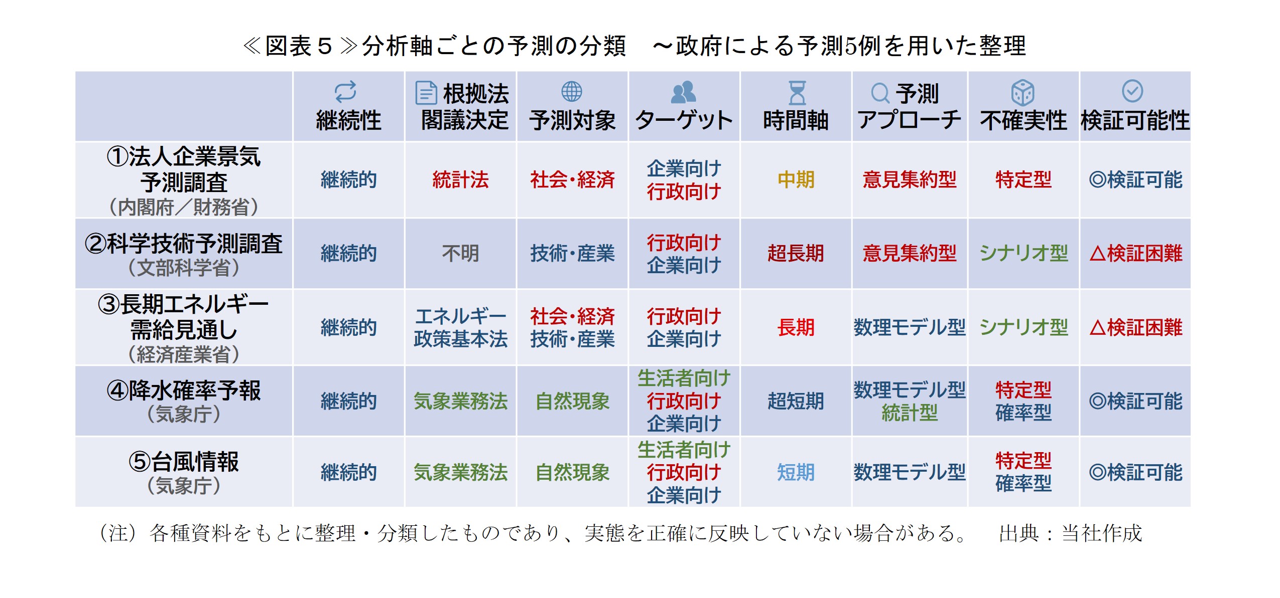はじめに、政府関係者にとって知名度が高いと思われる次の「政府による予測」を対象に、分析軸ごとに分類を行い、その結果を示した≪図表5≫。