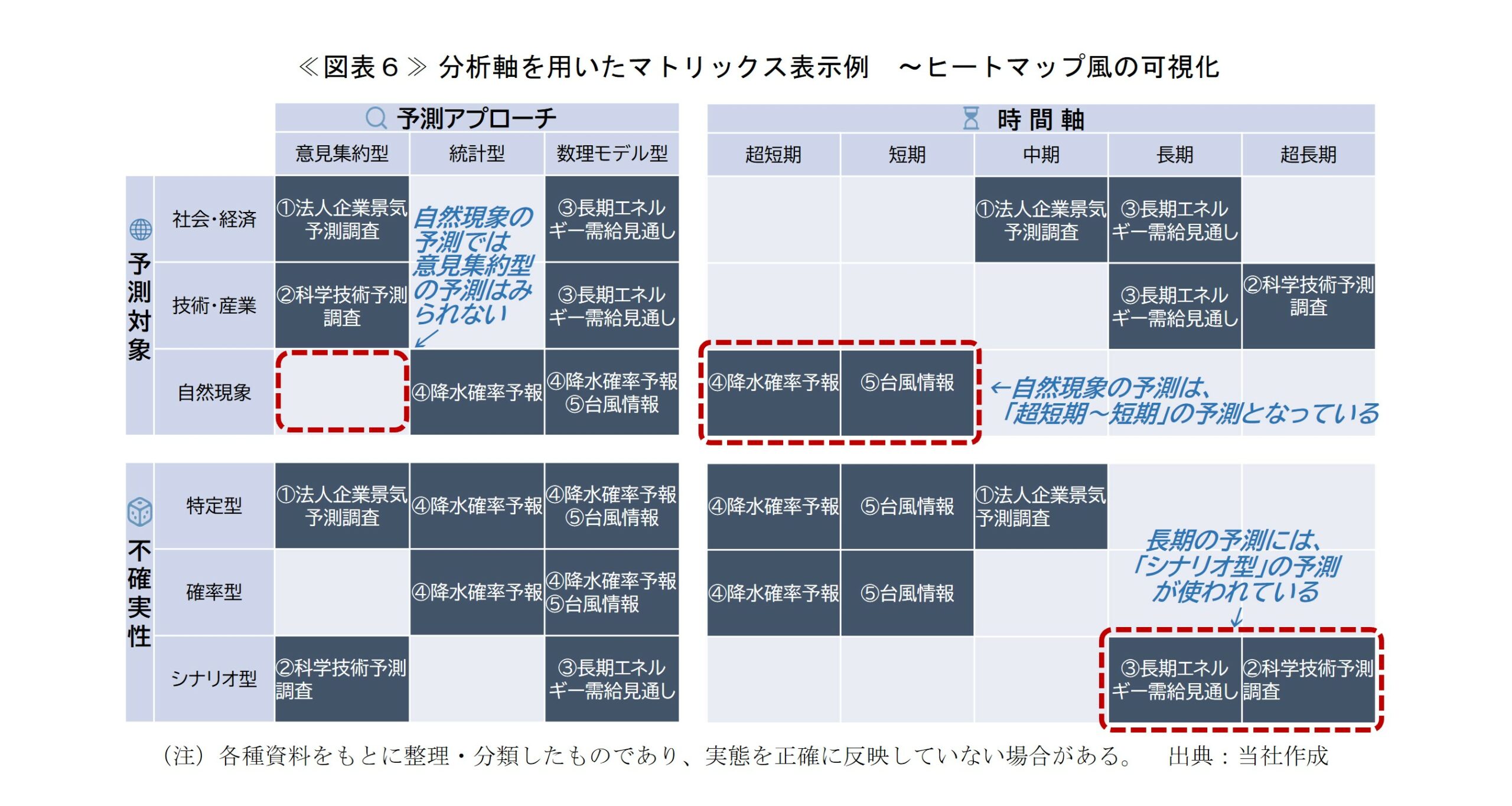 このマトリックスの各セルを、リストアップされた予測の件数に変えると、定量的なヒートマップとなる。以上のような可視化は、「政府による予測」の特徴を構造的・体系的に把握する手がかりを与え、予測の全体像や相互関係を理解するための有用なツールとなる。