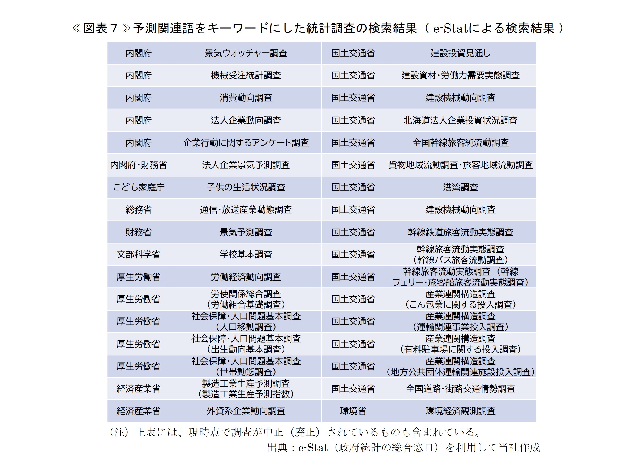 政府の統計調査には、将来の見通しを調査項目に含む場合があるため(法人企業景気予測調査もその一例)、予備的な調査として、「予測」に関連する内容を含む統計調査の抽出を試みた。