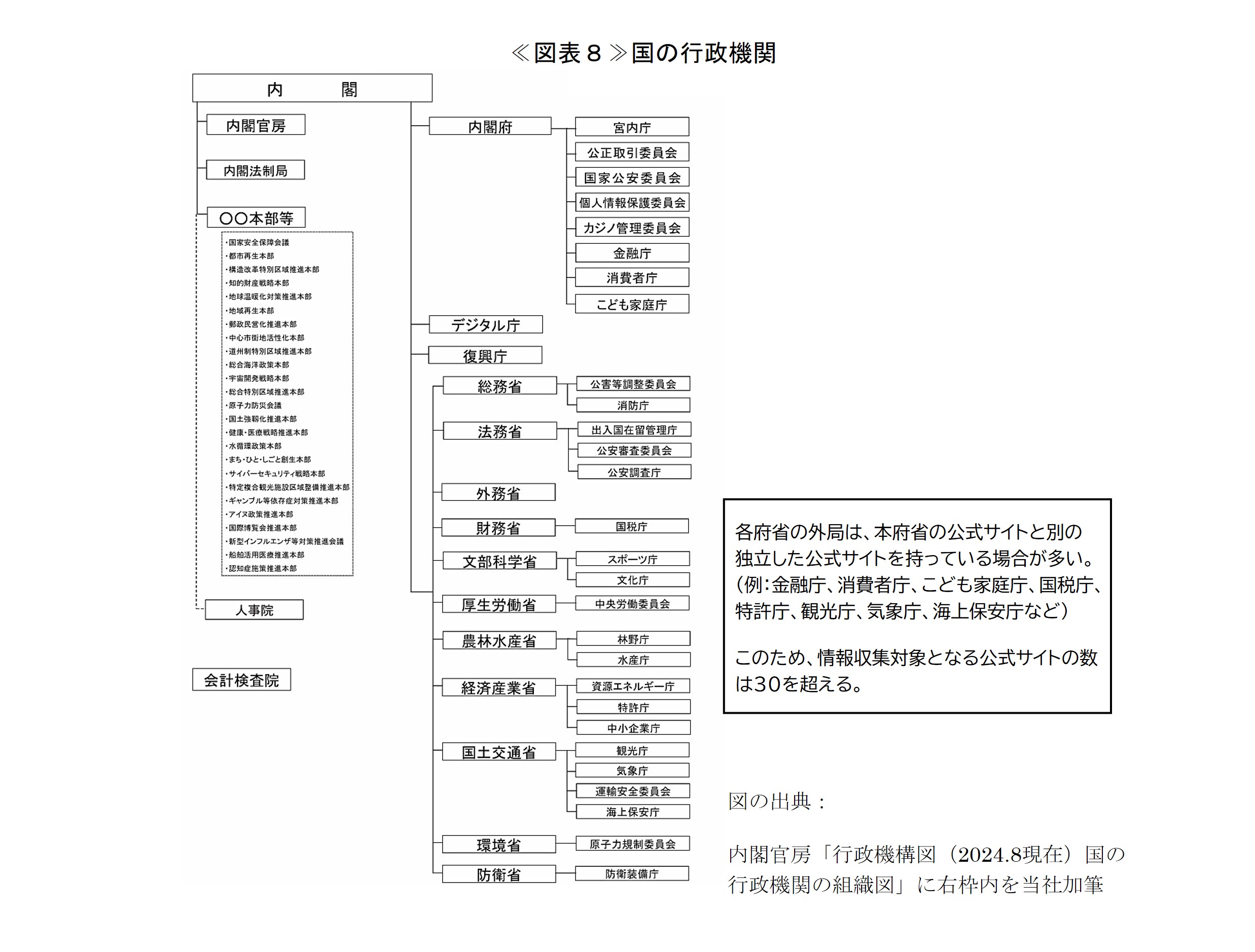 調査対象は、内閣官房、内閣府はじめとした全府省庁のほか、人事院、会計検査院を含めた国のすべての行政機関である≪図表8≫。