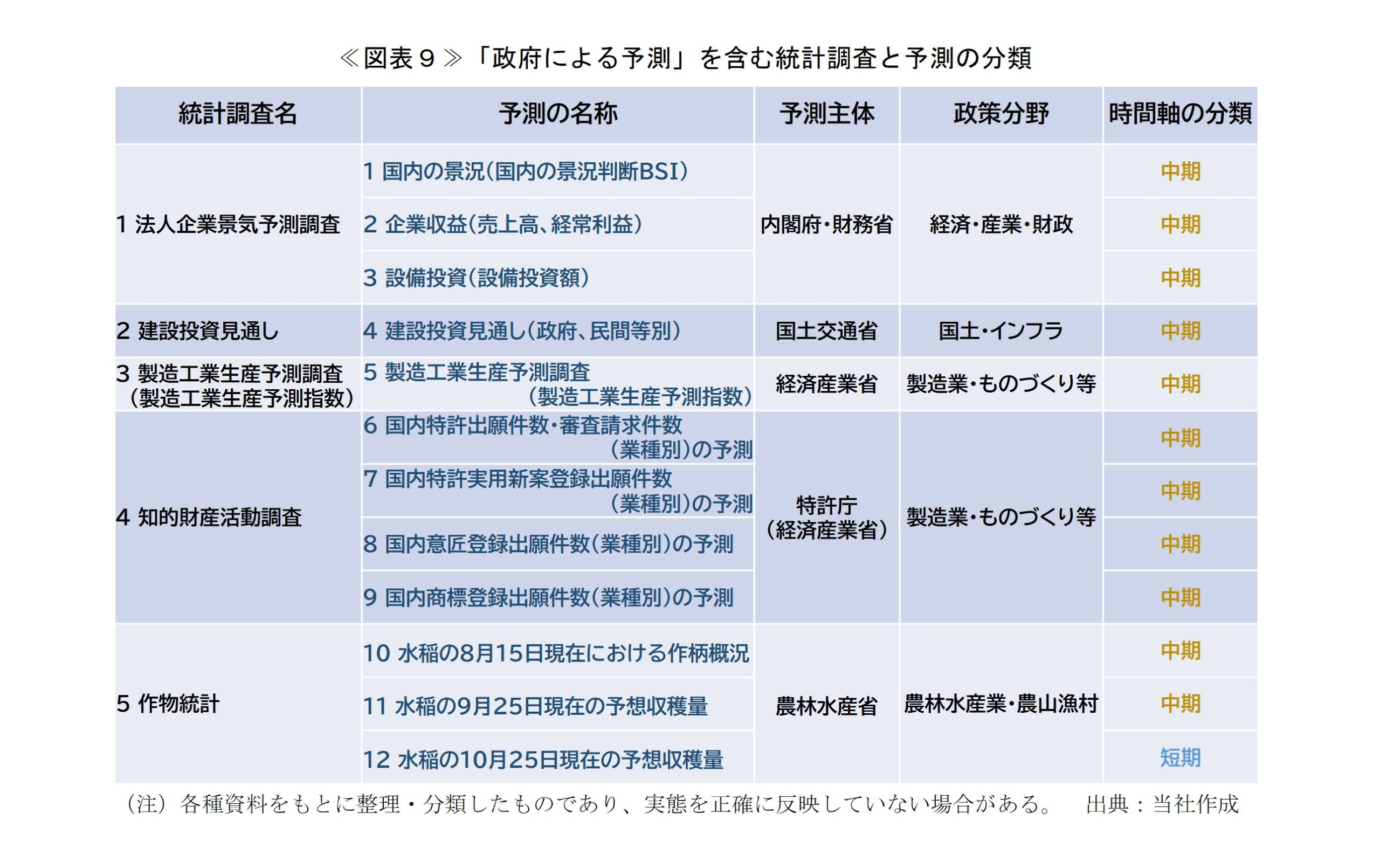 これらの調査では、計12件の「予測」が実施されており、1件の例外を除き、「中期」(最長予測期間が1か月間より長く5年間まで)の予測となっている≪図表9≫。このことは、断定こそできないが、結果の取りまとめや確認に一定の期間を要するという、統計調査の特性に起因している可能性が指摘される。
