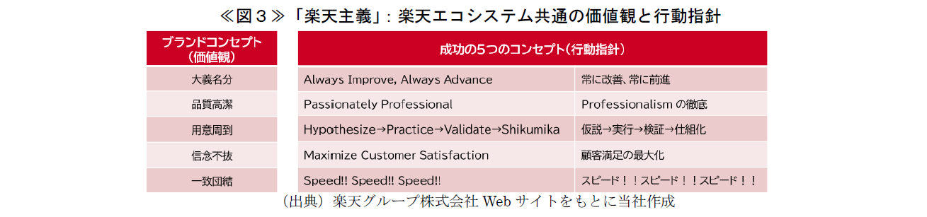 - 一連のヒアリングの中で、「大義」という言葉が多く聞かれた。これは、「楽天主義」の根幹を成す概念であり、楽天グループが掲げるミッションやビジョンを追求し、実現しようとする姿勢や目的そのものを指している。