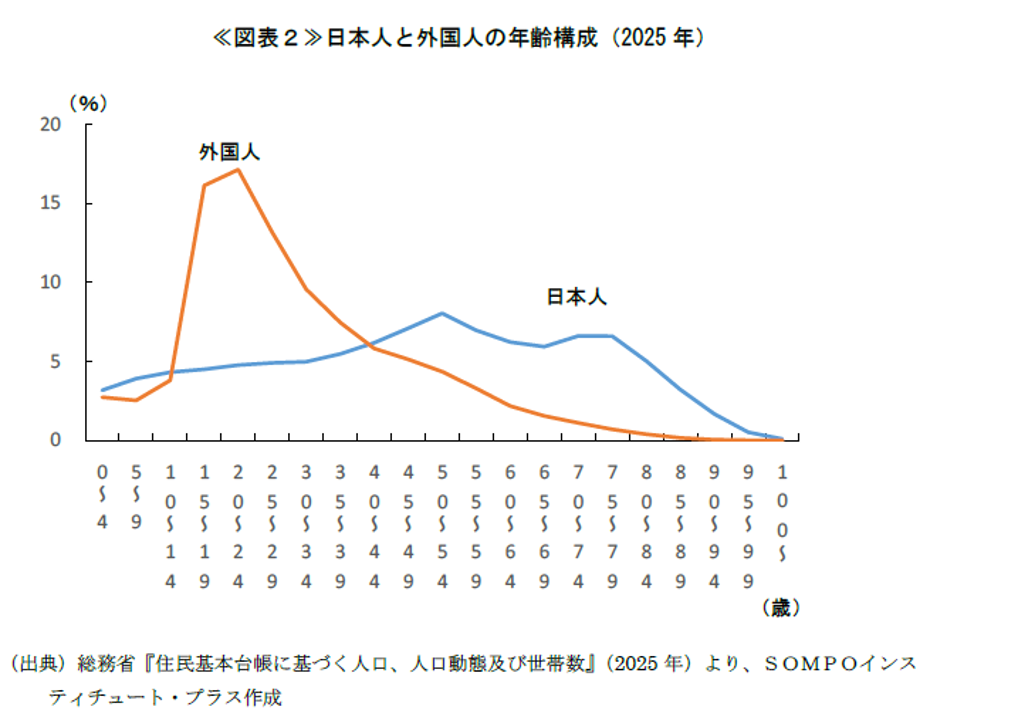 一方、外国人は出生が死亡を上回る自然増加であり、2024年の自然増加数は過去最多であった。外国人は日本人に比べてかなり若い年齢構成であることから、自然増加は今後も見込めよう。