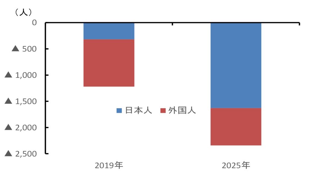 その背景の一つが転出超過であり(図表1)、2025年の転入超過数は人口がピーク時の2019年より大きく減少している。とりわけ、日本人の転出超過数は大きく拡大している