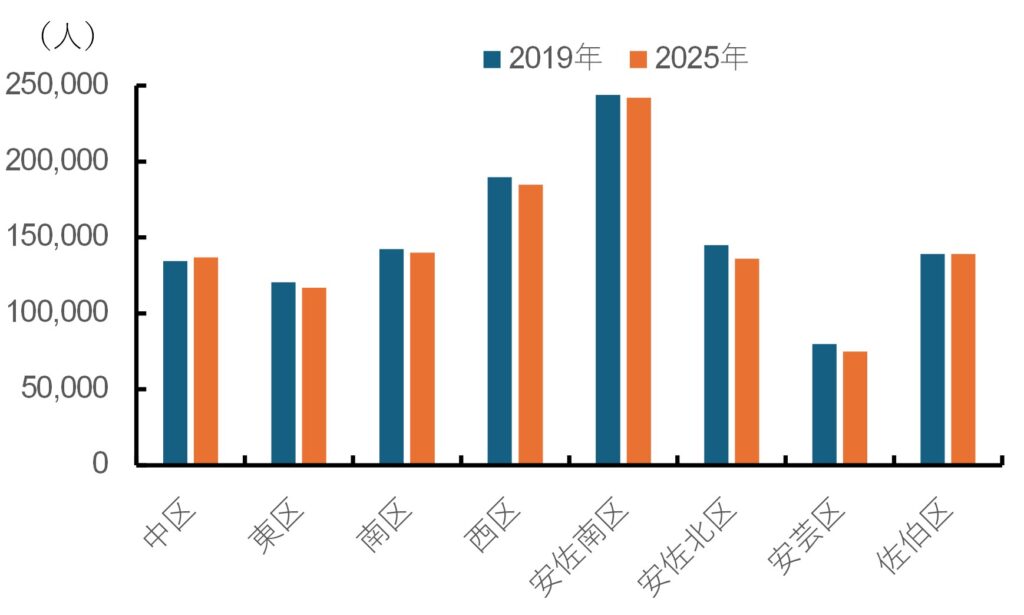 広島市は中心市街地の人口が他の大都市に比べて多く、路面電車によって日常的な移動がしやすいという特性を持つ。また、広島市の人口がピークであった2019年と直近の2025年を比較すると、広島市の中区以外の区は減少している中で、中心市街地を抱える中区の人口は微増しているように(図表3)、広島市の中心市街地はいまなお住むことに魅力がある。中心市街地への居住の魅力増進は中心市街地活性化に向けた有力な選択肢の一つであろう。
