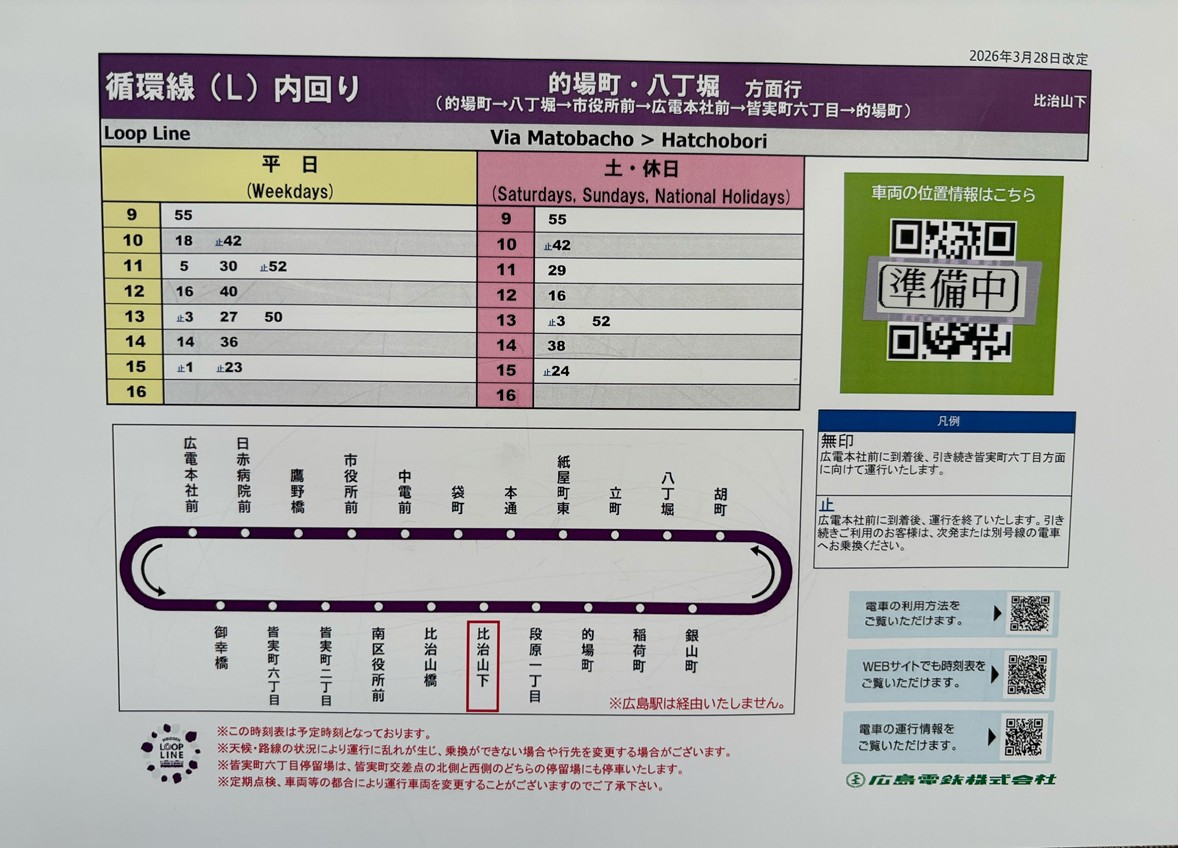 (写真右)循環線(比治山下)の実際のダイヤ。同駅の広島港行の運行本数は5本/時(平日10時~15時)であり、これと 比較しても循環線の運行本数は少ない。写真はいずれも現地にて当社撮影。