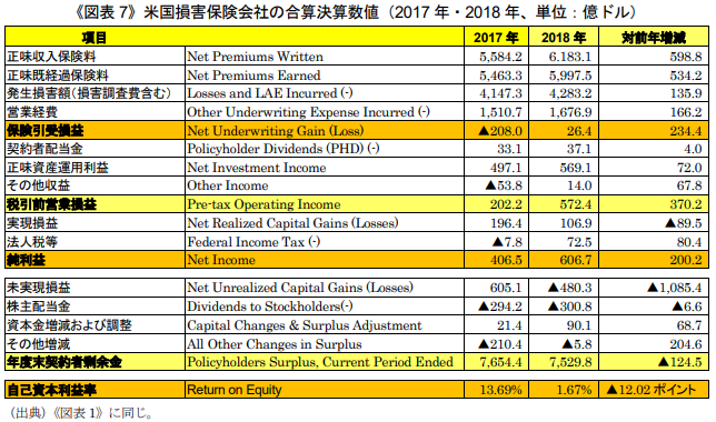ここからは NAIC への届出データに基づき、米国損害保険会社の 2018 年の決算概況を紹介する。2018年の米国損害保険会社の合算決算数値14は《図表 7》のとおりである。
