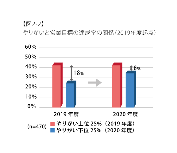 そこで、ある年度のやりがい上位25%と下位25%の営業拠点を抽出し、当年度だけでなく、翌年度以降の営業目標の達成率(達成するかしないか)に差があるかを分析してみました。図2-1は、2016年度のやりがい上位25%と下位25%の営業拠点が当年度だけでなく2017年度,2020年度に営業目標の達成率に差があるかを、図2ー2は2019年度のやりがい上位25%と下位25%の営業拠点が当年度だけでなく2020年度に営業目標の達成率に差があるかを比較しました。いずれも上位25%の営業拠点は下位25%と比べて当年度だけでなく、翌年度以降も営業目標の達成率が高いという結果になりました。