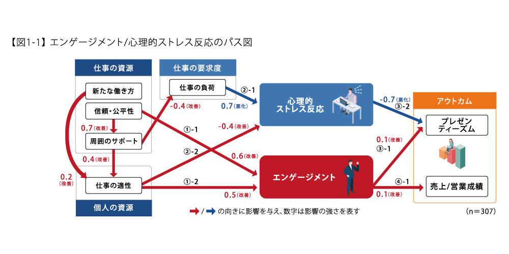 <エンゲージメント>、<心理的ストレス反応>、それらから生じるアウトカムである<プレゼンティーズム>や<売上/ 営業成績>に関して、