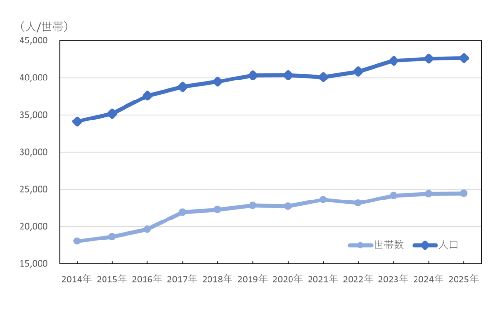 その転換点の一つが、2015年の愛育病院の移転である。南麻布から芝浦への移転によって、母子医療や災害医療の拠点が整備され、その隣接地には行政・防災・福祉機能を集約した複合施設「港パーク芝浦」が新設された。行政機能と医療機能が一体的に配置されたことで、医療・防災・子育て支援を兼ね備えた地域生活の基盤が形成された。周辺では住宅や保育施設、公園の整備も進み、「働くだけの街」から「暮らしを支える街」へと変化の方向性を明確にした(田町駅近辺の人口・世帯数推移は図表参照)。