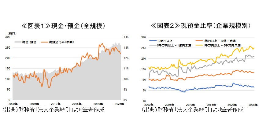 コーポレートガバナンス・コード改訂に向けて、上場企業による現預金の活用に関する議論がなされていることが報じられている1。法人企業統計をみると、企業が保有する現預金の金額は大きく増加し、足もとでは250兆円を上回る水準に達している2。それに伴い、総資産に占める現預金の割合(以下、現預金比率)も12%と高い(図表1)。企業が儲けを設備投資にも賃金にも回さず、ひたすら貯め込んでいるという言説に沿うようなデータが示されている。