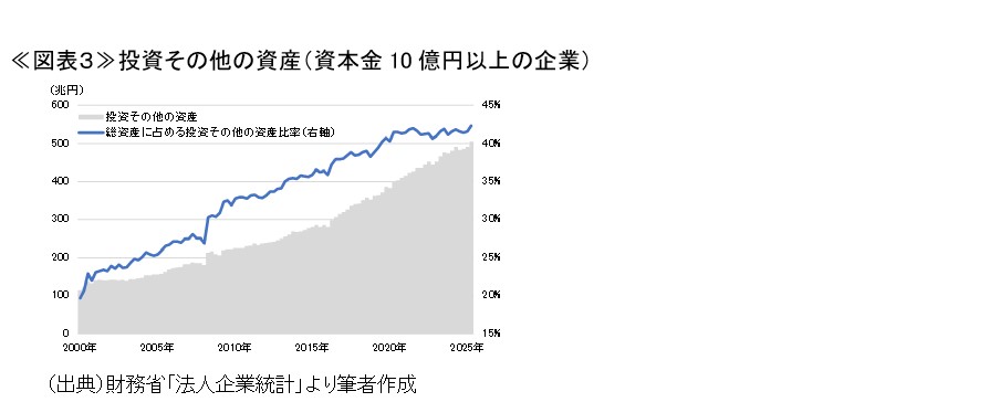 資本金10億円以上の大企業においては、むしろ投資姿勢を積極化させている。とりわけ、子会社株式や関連会社株式等で構成される投資その他の資産については増加傾向での推移が鮮明となっており(図表3)、大企業が現預金を貯め込まず、投資に回している様子がうかがえる。