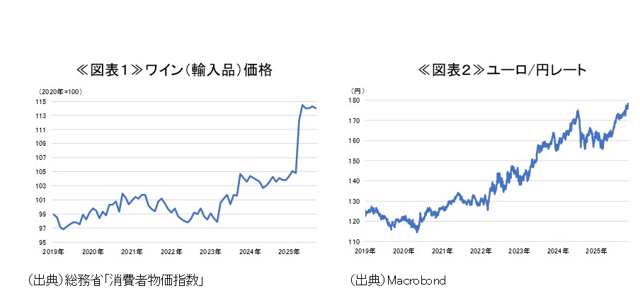 理由として挙げられるのが、ワイン価格の上昇だ。物価上昇が進む中、ワイン価格も例に漏れず大きく上昇している(図表1)。足もとではユーロ/円レートが170円台後半で推移するなど、過去最高値を更新する歴史的なユーロ高となっており(図表2)、価格上昇に作用しているものと考えられる。ボージョレ・ヌーボーはフランスからの輸入品であり、ユーロ高が価格上昇にダイレクトに響くことになるからだ。一般に、ワインをはじめとした嗜好品は価格弾力性が高く、価格上昇によって需要が減少するとされている。歴史的なユーロ高はボージョレ・ヌーボー商戦に対する強い向かい風となるだろう。