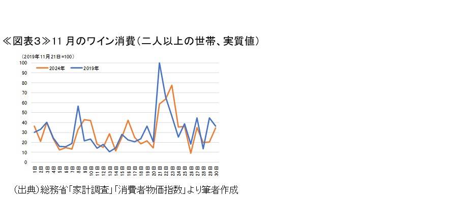 ここで、家計調査から確認できる過去のデータを確認すると、昨年のボージョレ・ヌーボーの解禁日での家計によるワイン消費は、コロナ前の2019年と比較して8割程度に止まっていた1(図表3)。昨年11月のユーロ/円レートが160円台近辺で推移していたことを考慮すると、今年は輸入価格が更に押し上げられることが想定され、ボージョレ・ヌーボーへの需要は更に抑制される可能性が高い。