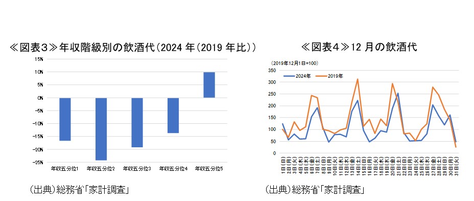 物価高は今年も継続しており、忘年会の向かい風となることが予想される。東京商工リサーチが2025年11月に実施したアンケート調査2によると、費用削減を理由に忘年会を実施しない企業が増加していることが指摘されており、物価高が忘年会の実施に影響を及ぼしていることが示唆される。総務省が公表する家計調査で12月の飲酒代について確認すると、物価が大きく上昇しているにもかかわらず、2024年の飲酒代支出はコロナ前の2019年と比較して減少している(図表3)。翌日が休日である金曜日と土曜日に支出が大きくなることは共通しているが、2024年は平日での飲酒代が低水準で推移しており、忘年会による支出増の様子が伺えない(図表4)。とりわけ、職場の忘年会がピークを迎える傾向にある12月第3週3において、かつてのような押し上げ効果がみられていない。2025年においても物価高を背景とした下押し圧力は強く、同様の動きが続くことが見込まれる。