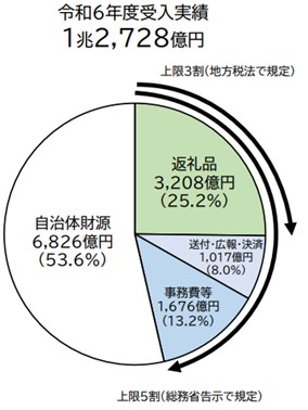 一方、残された課題として、制度運営コストの問題も看過できない。ふるさと納税は返礼品の調達費用に加え、仲介サイト利用料や事務費用が寄付額に応じて発生する。2025年度の募集経費全体は5,901億円であり、そのうち返礼品の調達にかかる費用は3,208億円、事務に係る費用等は1,676億円となっている。また、ふるさと納税に係るポータルサイト運営事業者に支払った費用は1,656億円に達しており、寄付金額の13.0%を占めている3