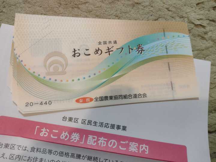 2025年10月から物価高対策の一環として台東区で独自に発行されているおこめ券の実物(440円×10枚)で、SOMPOインスティチュート・プラス撮影。