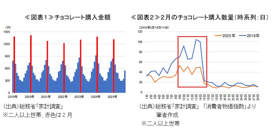来月14日はバレンタインデー。1年で最もチョコレートの販売が伸びる時期である。家計調査でチョコレート購入金額をみても、2月のチョコレート購入金額が他の月と比較して突出して大きいことが確認できる(図表1)。ただ、バレンタインデーにおけるチョコレートの購入金額については、二つの大きな下押し圧力が生じている。