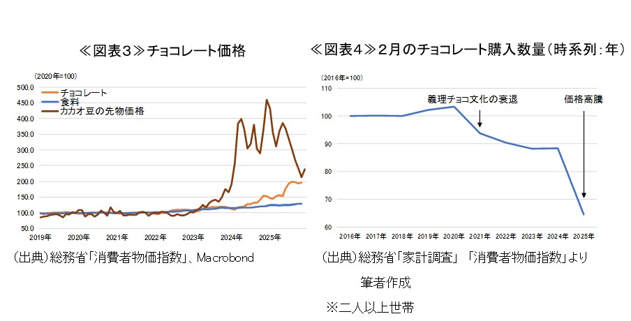 義理チョコ離れとカカオ価格の高騰はチョコレートの購入数量1に対する強い下押し圧力となっており、コロナ後とカカオ価格上昇後に明確な水準の切り下げ2が確認されることからも、バレンタイン商戦における強い向かい風となっていることが示されている(図表4)。