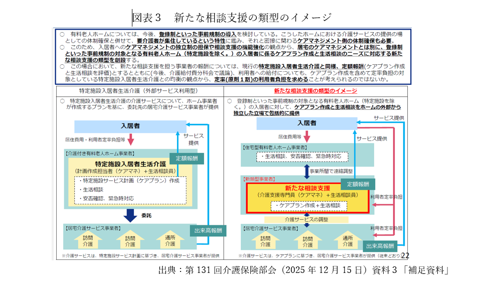 - この点は注2のとおり今後、介護給付費分科会等で議論されることとなっている。全国有料老人ホーム協会(有老協)では二重徴収となる可能性を指摘している。(https://www.yurokyo.or.jp/info/view/6251 アクセス日2026/01/15)