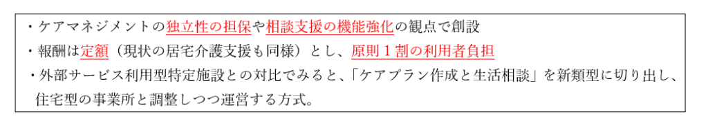 ケアプラン(介護サービス計画)の作成を含む以上、新類型は「居宅介護支援」から発展するものといえる。主として、居宅事業所が、住宅型への入居者への対応のために新たに指定を取ることが考えられる。