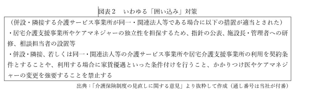 これと関連して、いわゆる「囲い込み4」への対策として、ケアマネ事業所=居宅介護支援事業所(以下、「居宅事業所」)やケアマネジャーの独立性の担保等が盛り込まれている(図表1⑷及び図表2参照)。住宅型の中には、入居者獲得のため家賃を近隣相場より低額に設定し、一方で必ずしも必要の無い介護サービス(過剰なサービス)の提供を行うことで、介護保険からの収入で事業を成り立たせている事業者がいるのではと指摘されてきたことへの対策とみられる。