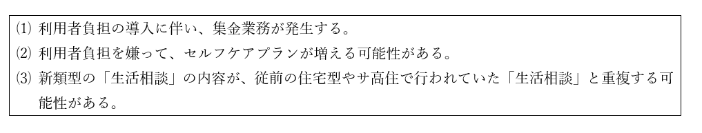 新類型の⑶「生活相談」が、既に利用者負担で実施されている、住宅型やサ高住で行われる生活相談と、どのように異なるのか、住宅型の運営者に対して新類型の事業所が相談の結果をどのように働きかけるのか、さらに利用者にとってどのような付加価値があるのかが見えていない7。
