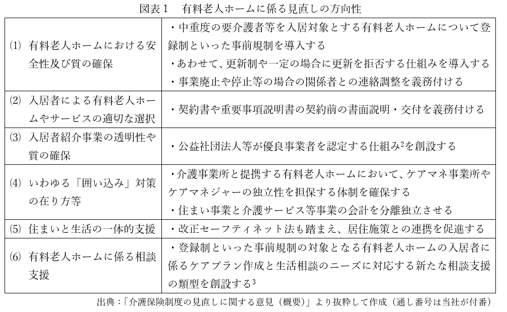 有料老人ホームのあり方については、介護保険部会とは別に「有料老人ホームにおける望ましいサービス提供のあり方に関する検討会」でとりまとめ1が2025年11月5日に公表されている。このとりまとめも踏まえて、介護保険部会にて引き続き審議され、「介護保険部会意見」が取りまとめられた。その中に有料老人ホームに係る見直しの方向性も含まれている(図表1参照)。