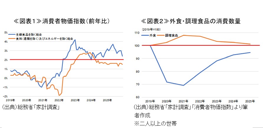 一方で、懸念されるのは外食産業への影響だ。食料品への消費税率が0%となり、外食の消費税率が10%となり、両者の価格差が大きく開くことになれば、外食離れが進みかねない。コロナ禍において弁当やパン、おにぎりをはじめとした調理食品の消費が増加した一方で、外食消費は大きく減少した。こうした影響は2021年に最も色濃く生じたが、時間の経過と共に正常化に向かい、両者はようやくコロナ前に戻りつつあるところであった(図表2)。しかし、食料品への消費税率が0%になれば、再び調理食品が有利、外食が不利という構図が復活することが予想される。