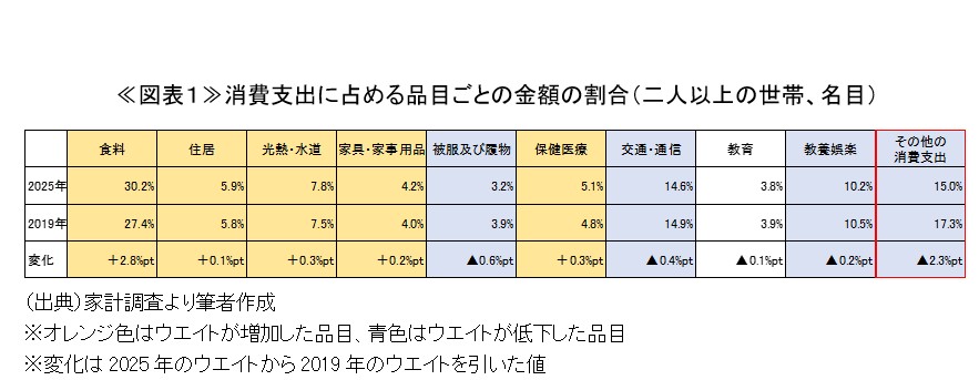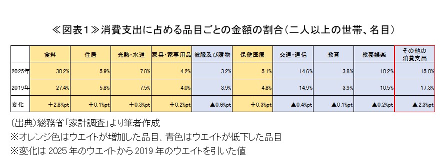 長引く物価高の中で、家計の消費行動に変化が生じている。物価上昇前の2019年と物価上昇の影響を受けた2025年とを比較すると、家計の消費行動の変化が浮かび上がる。食料や住居、光熱・水道といった生活必需品のウエイトが上昇する一方で、教養娯楽や被服及び履物など、選択的支出のウエイトが低下している(図表1)。