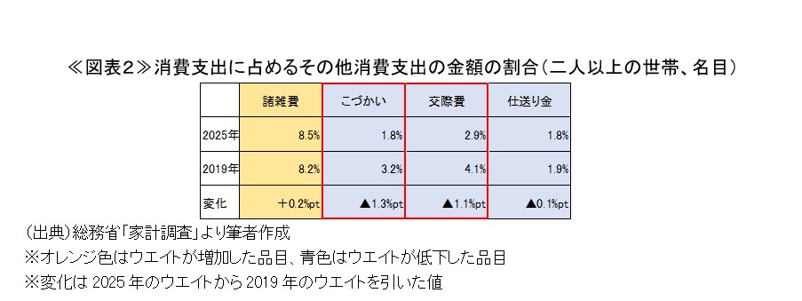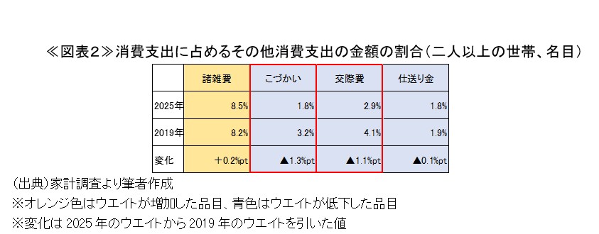 最も大きくウエイトが低下したのは、その他の消費支出である。その他消費支出の内訳を確認すると、こづかいと交際費の急減が際立っている(図表2)。ウエイトのみならず、金額をみても、こづかいが68,928円(2019年:111,665円)と2019年比▲38.3%、交際費は111,052円(2019年:142,851円)と同▲22.3%となっており、共に大幅な減少となっている。インフレが進行することでただでさえ実質購買力が低下している中、こづかいと交際費については名目ベースでも大幅な減少がみられている。