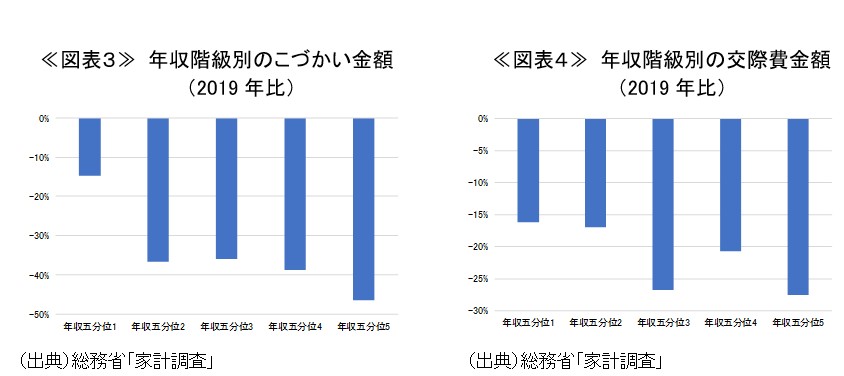 興味深いのは、こづかい・交際費共に高所得者において金額の減少幅が大きいことだ(図表3、図表4)。年収五分位5(最も所得の高い階級)がこづかいにおいても、交際費においても、他の階級と比較して金額の減少幅が大きくなっている。年収五分位5でのこづかいや交際費の絶対額は他の階級として高いものの1、金額の減少幅が大きいことは、節約余地の大きさによるものであると考えられる。逆に考えると、年収の低い世帯においては、こづかいや交際費といった選択的支出の削減余地が既に小さくなっていると考えられる。