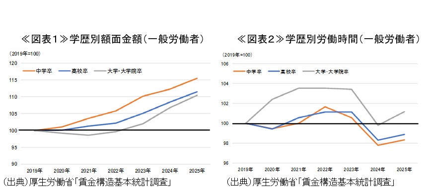 労働時間についてみると、大学・大学院卒が2019年比で増加する一方で、中学卒と高校卒に減少の動きがみられている(図表2)4。働き方改革関連法によって建設業・物流業などに対象業種が拡大されたことや、人手不足による待遇改善が進展したことなどが大きく影響したものとみられる。