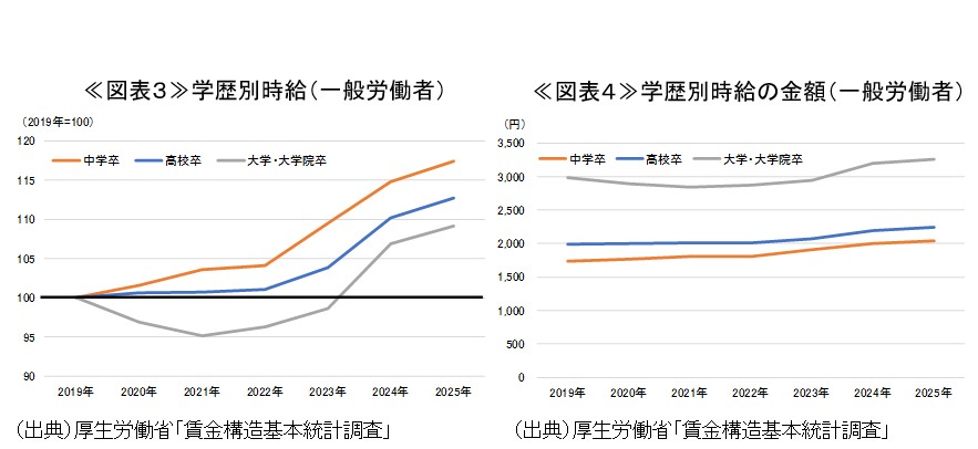 時給については、これら額面金額と労働時間を用いて算出されることから、中学卒が最も速いペースで上昇しており、高校卒、大学・大学院卒が続く形となっている(図表3)5。中学卒と高校卒は、額面金額の上昇と労働時間の減少が共に作用することで、大学・大学院卒と比較して大きく上昇している。