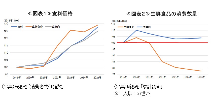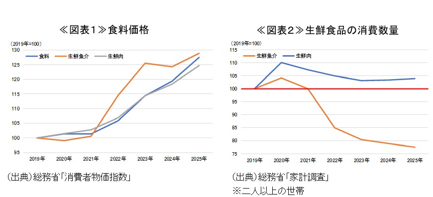 そうした中、家計調査で消費数量を確認すると、生鮮肉に増加の動きがみられる一方で、生鮮魚介は大きく数量が減少している(図表2)。更に、2025年の生鮮魚介の消費数量と価格の2019年対比での伸び率をプロットすると、価格の上昇幅が大きい品目ほど消費数量が減少する傾向にあることが示されている1(図表3)。