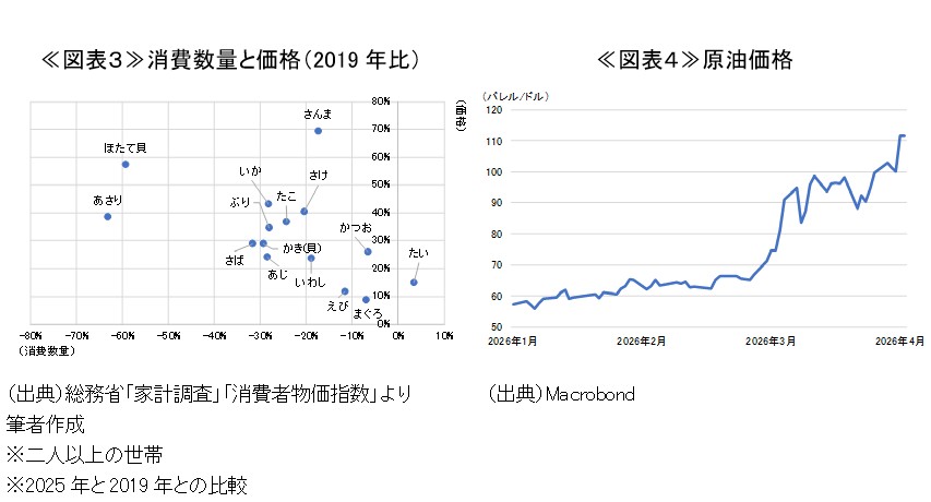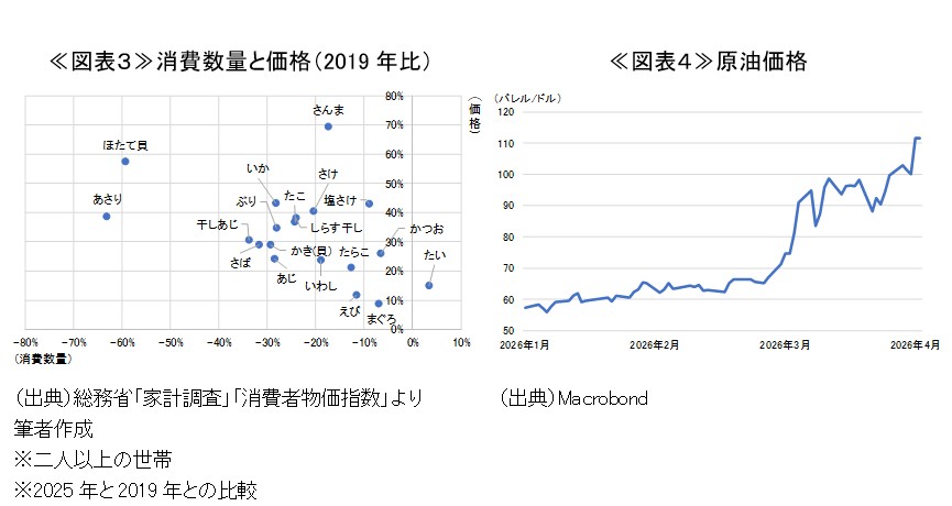 また、足もとでは、中東情勢の悪化に伴い原油価格が大きく上昇している(図表4)。漁業に用いる燃料価格や輸送・養殖コストの押し上げによって、魚介類の価格は今後も上昇する可能性が高いだろう。